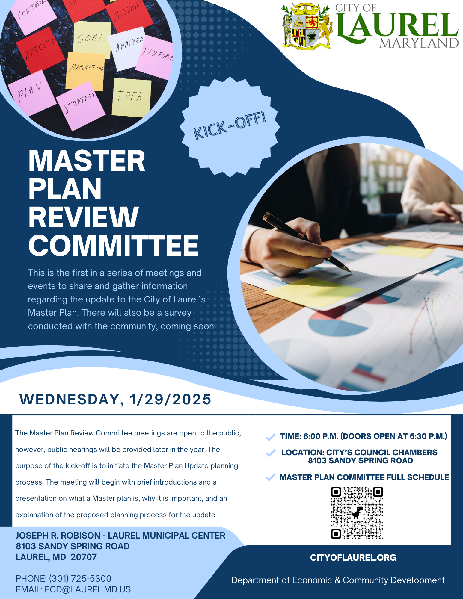 The City of Laurel Master Plan Review Committee is underway, tasked with reviewing and updating all elements of the current City of Laurel Master Plan. This Committee will meet on a monthly basis, typically on the last Tuesday of the month at 6:00 p.m. The public is encouraged to attend, however public comment is only during public hearing sessions.